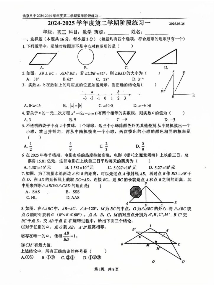 北达教研组收集整理了北京八中2025年初三3月月考数学试卷,分享给大家,快来下载复习吧。