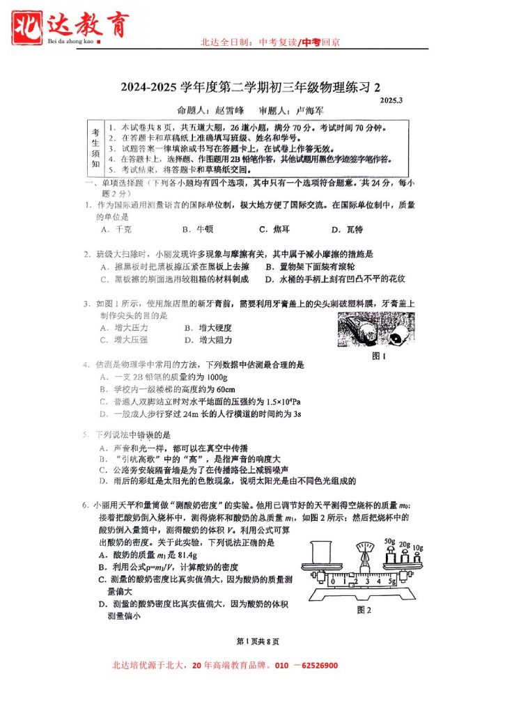 北达教研组收集整理了2025人大附中初三3月月考物理试卷及答案,分享给大家,快来下载复习吧。 北京北达全日制学校,中高考复读,外地回京中高考 电话咨询:400-6168182 01…
