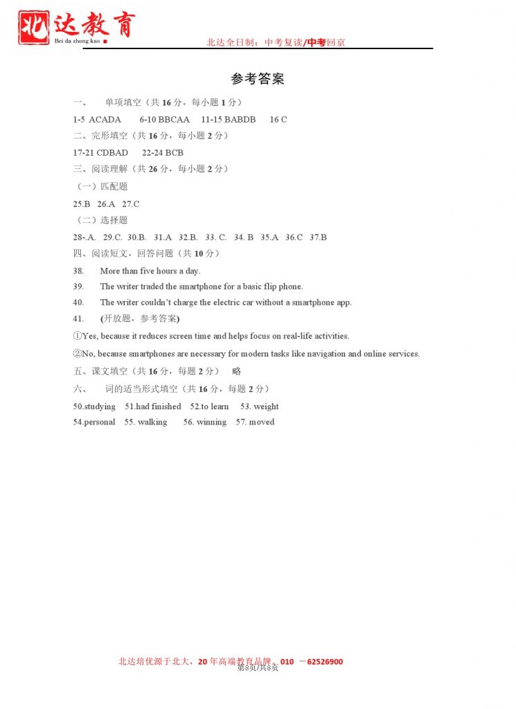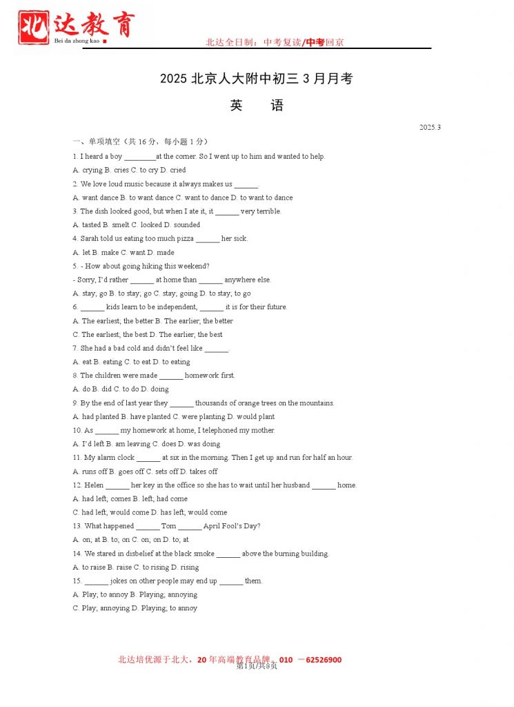 北达教研组收集整理了人大附中2025年初三3月月考英语试卷及答案,分享给大家,快来下载复习吧。 北京北达全日制学校,中高考复读,外地回京中高考 电话咨询:400-6168182 0…