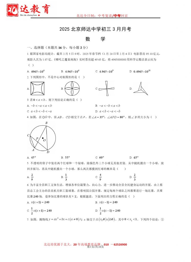 北达教研组收集整理了2025师达中学初三3月月考数学试卷及答案,分享给大家,快来下载复习吧。