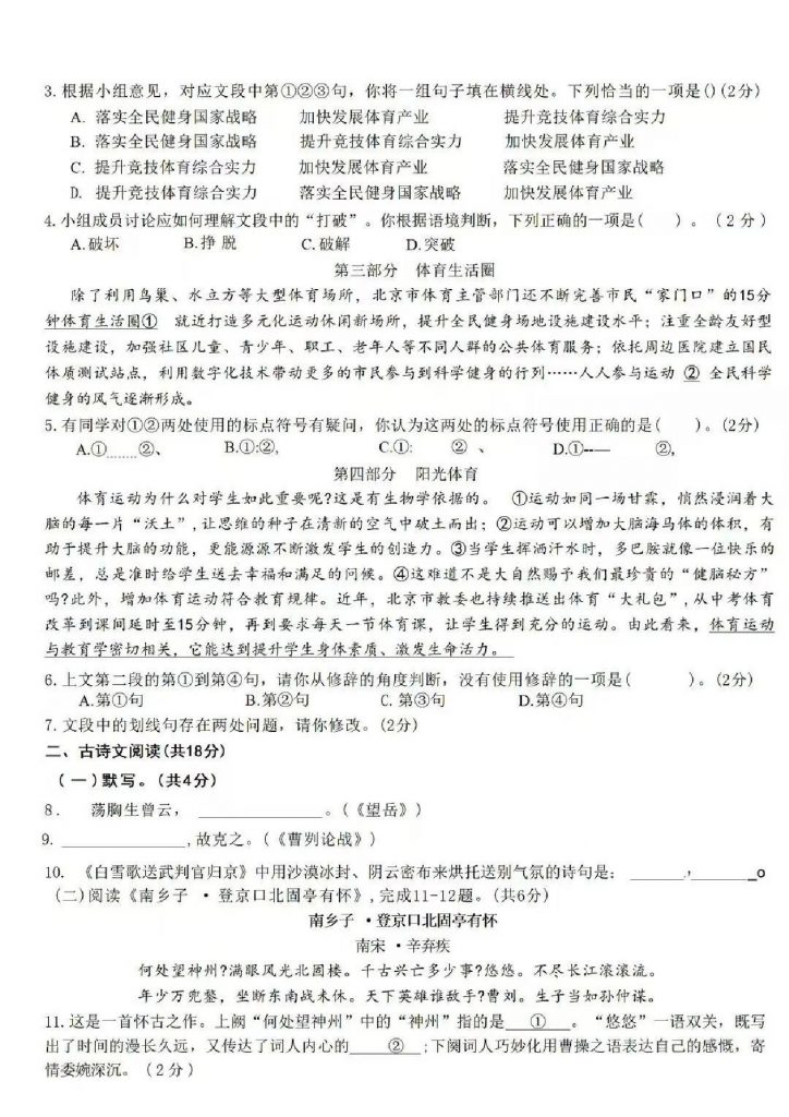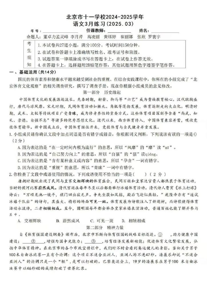 北达教研组收集整理了2025北京十一学校初三3月月考语文试卷,分享给大家,快来下载复习吧。