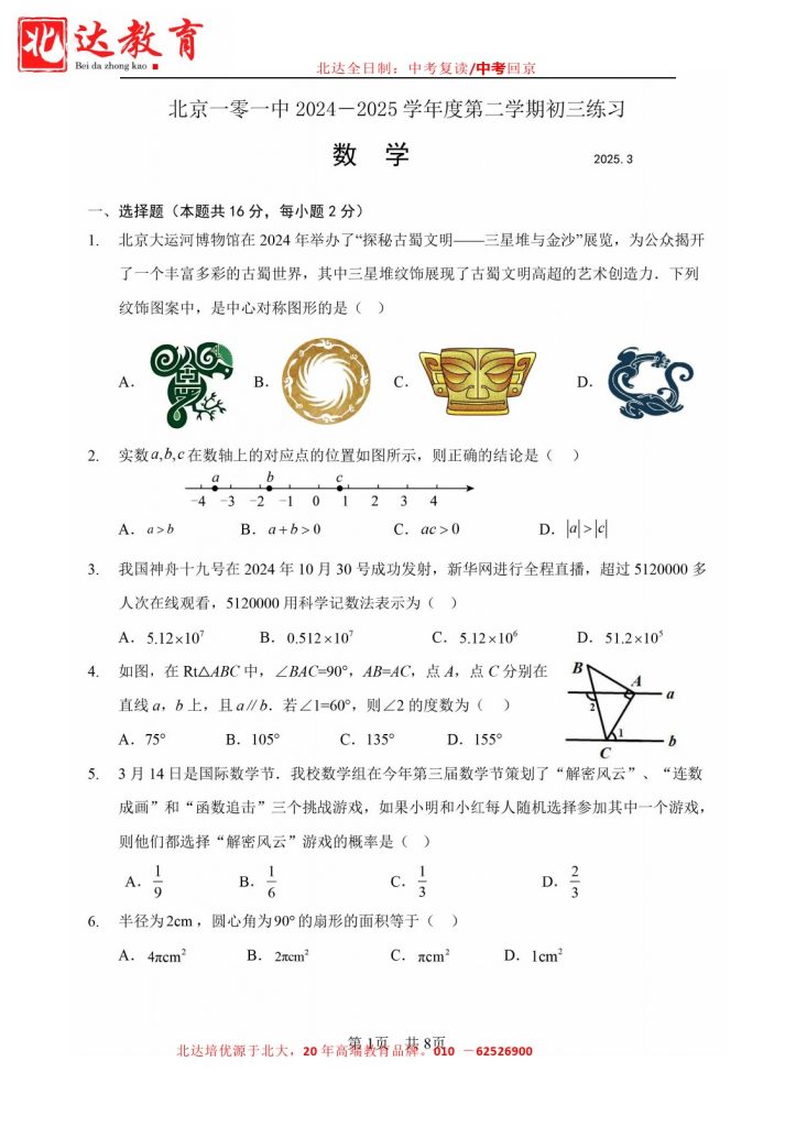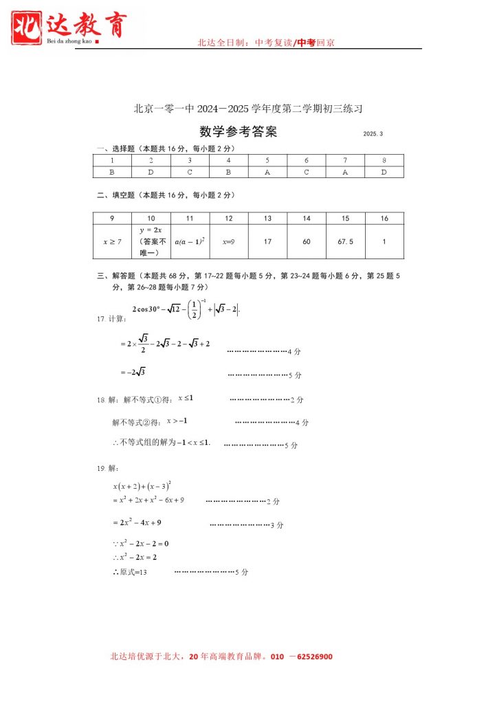 北达教研组收集整理了2025年北京一零一中初三3月月考数学试卷及答案,分享给大家,快来下载复习吧。