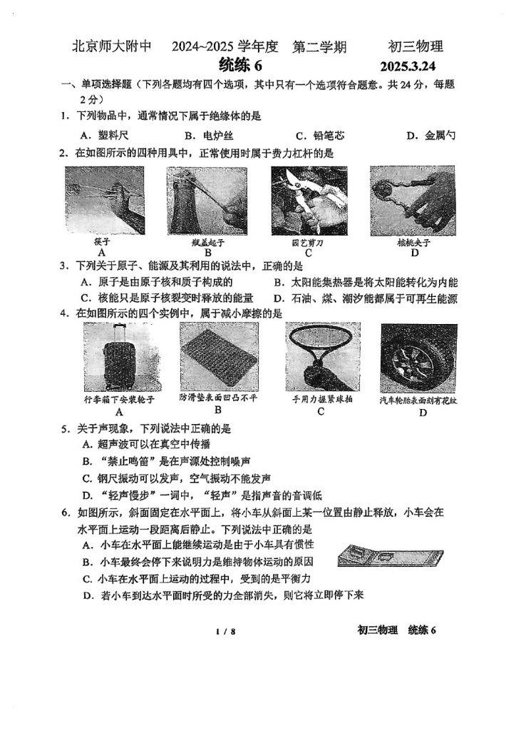 首页 初三试题 2025北师大附中初三(下)统练六物理试卷