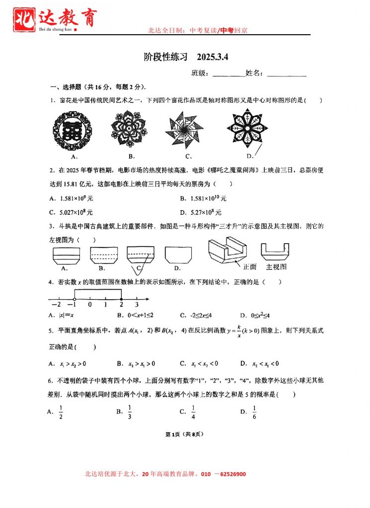 北达教研组收集整理了2025北师大实验中学初三3月月考数学试卷,分享给大家,快来下载复习吧。 北京北达全日制学校,中高考复读,外地回京中高考 电话咨询:400-6168182 01…