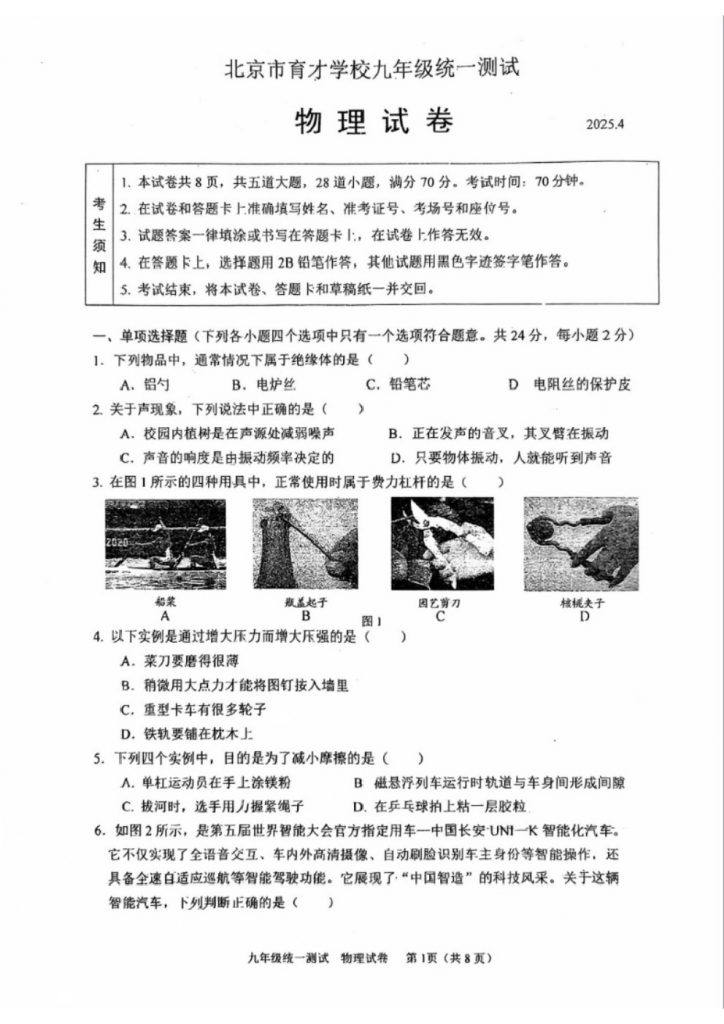 北达教研组收集整理了2025北京育才学校初三零模物理试题,分享给大家,快来下载复习吧。