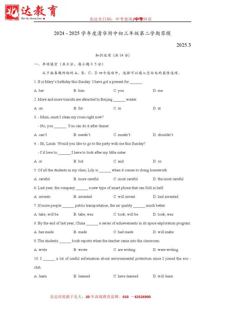 北达教研组收集整理了北京清华附中2025初三零模英语试题及答案,分享给大家,快来下载复习吧。