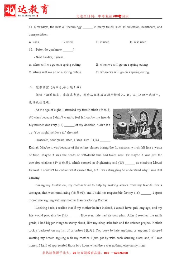 北达教研组收集整理了北京清华附中2025初三零模英语试题及答案,分享给大家,快来下载复习吧。 北京北达全日制学校,中高考复读,外地回京中高考 电话咨询:400-6168182 01…