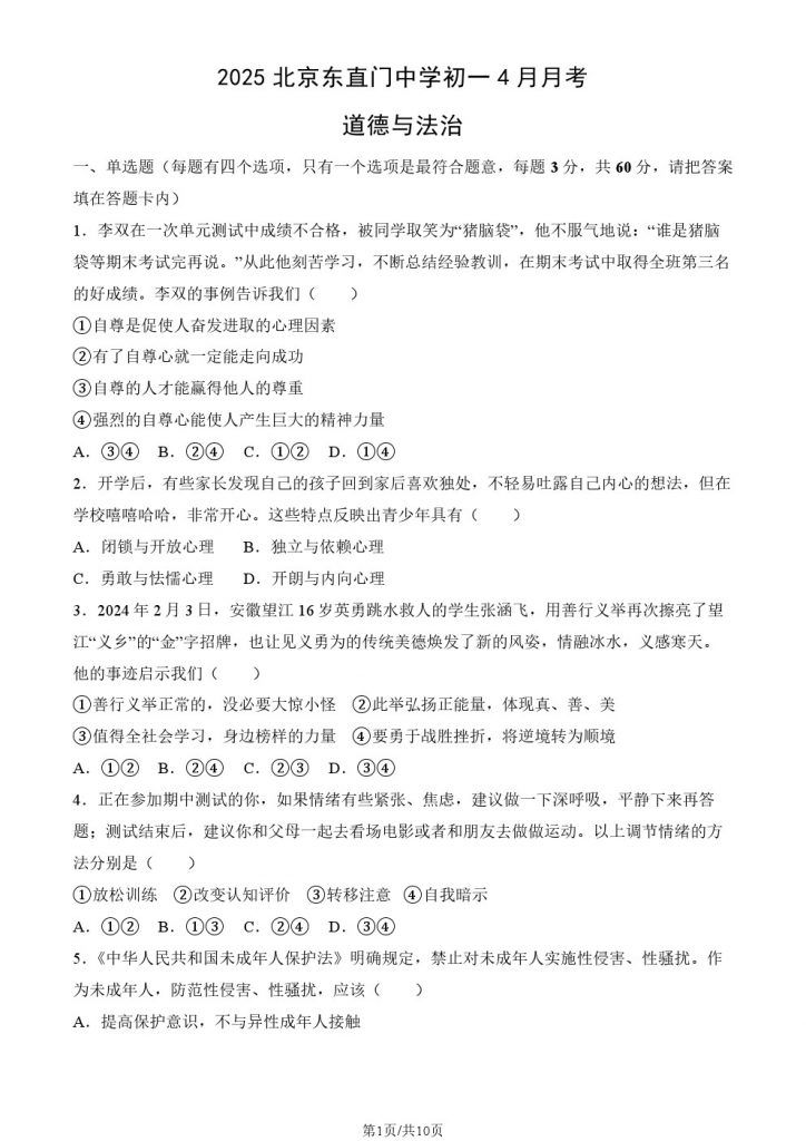 北达教研组收集整理了2025北京东直门中学初一4月月考道法试题及答案,分享给大家,快来下载复习吧。