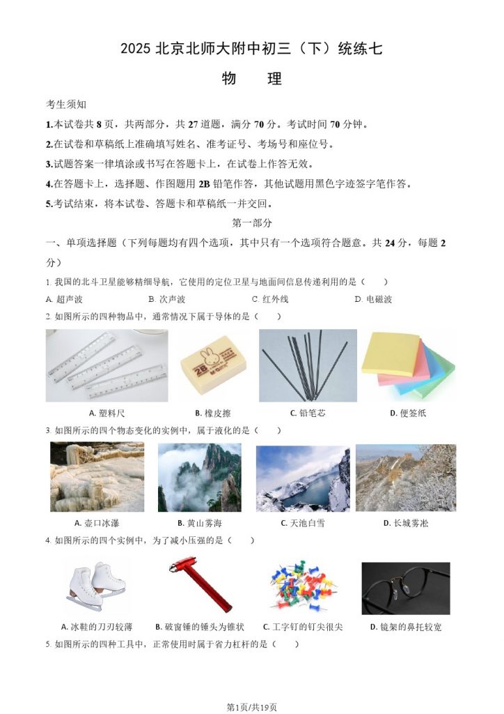 北达教研组收集整理了2025北师大附中初三(下)统练七物理试题及答案,分享给大家,快来下载复习吧。