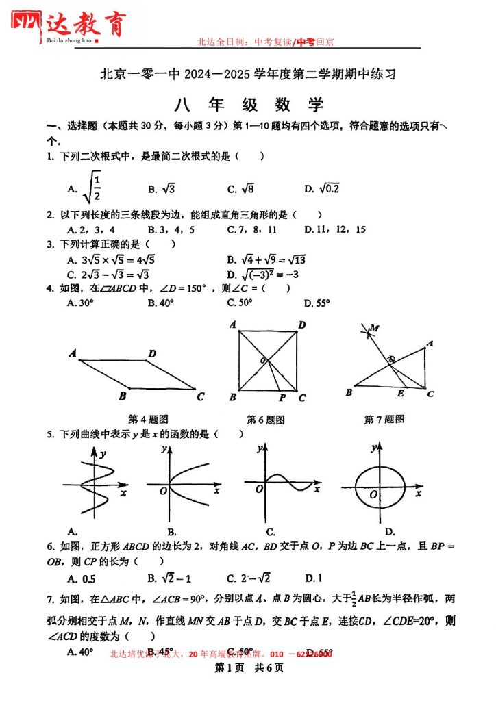 2025北京各区初二期中考已陆续开始,北达教研组整理了2025北京一零一中初二(下)期中数学试题,分享给大家。
