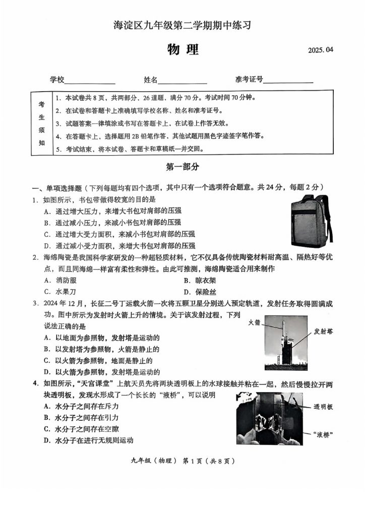 2025北京各区初三一模已陆续开始,北达教研组整理了2025北京海淀初三一模物理试题及答案,分享给大家。快来下载复习吧。