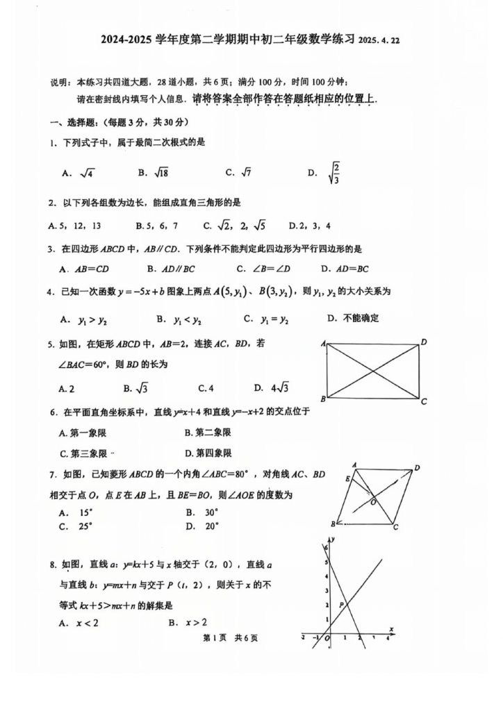 2025北京各区初二期中考已陆续开始,北达教研组整理了2025北京人大附中初二(下)期中数学试题,分享给大家。