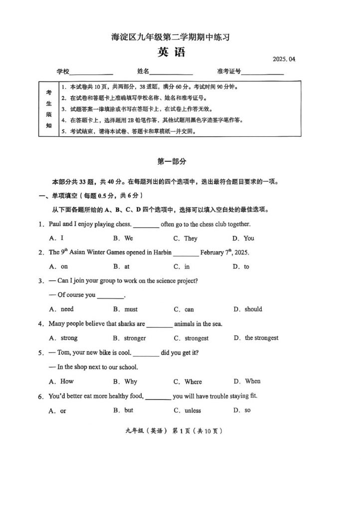 2025北京各区初三一模已陆续开始,北达教研组整理了2025北京海淀初三一模英语试题及答案,分享给大家。快来下载复习吧。