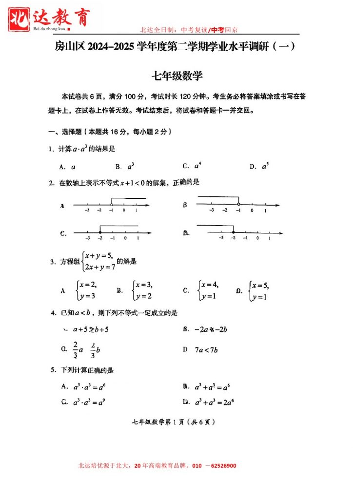 2025北京各区初一期中考已陆续开始,北达教研组整理了2025北京房山区初一(下)期中数学试题,分享给大家。