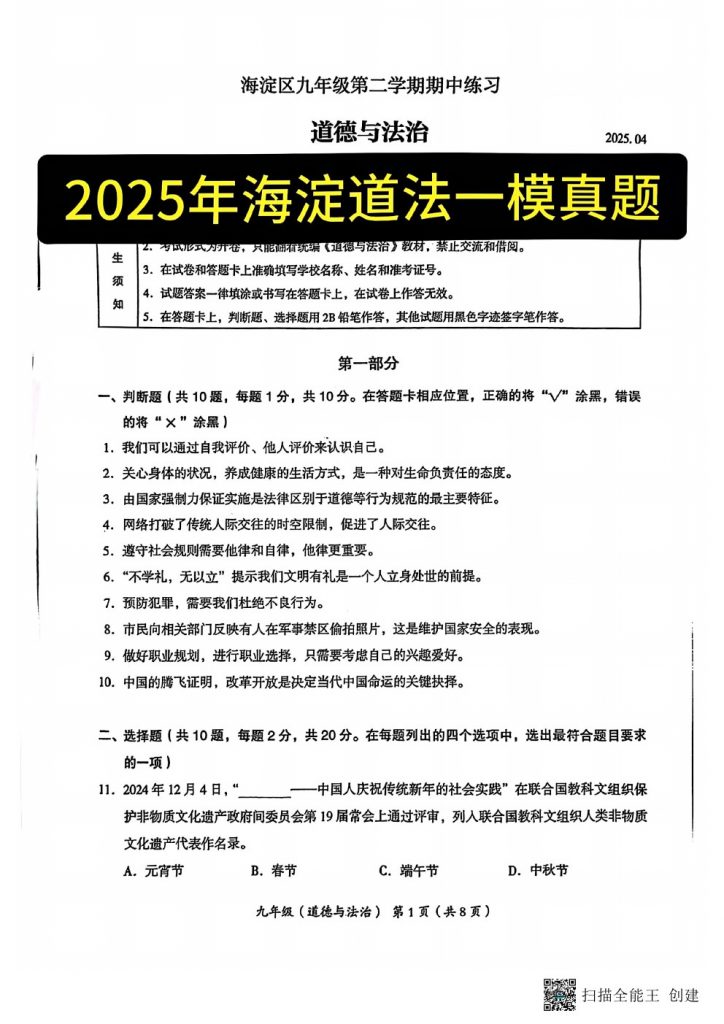 2025北京各区初三一模已陆续开始,北达教研组整理了2025北京海淀区初三一模道法试卷,分享给大家。快来下载复习吧。