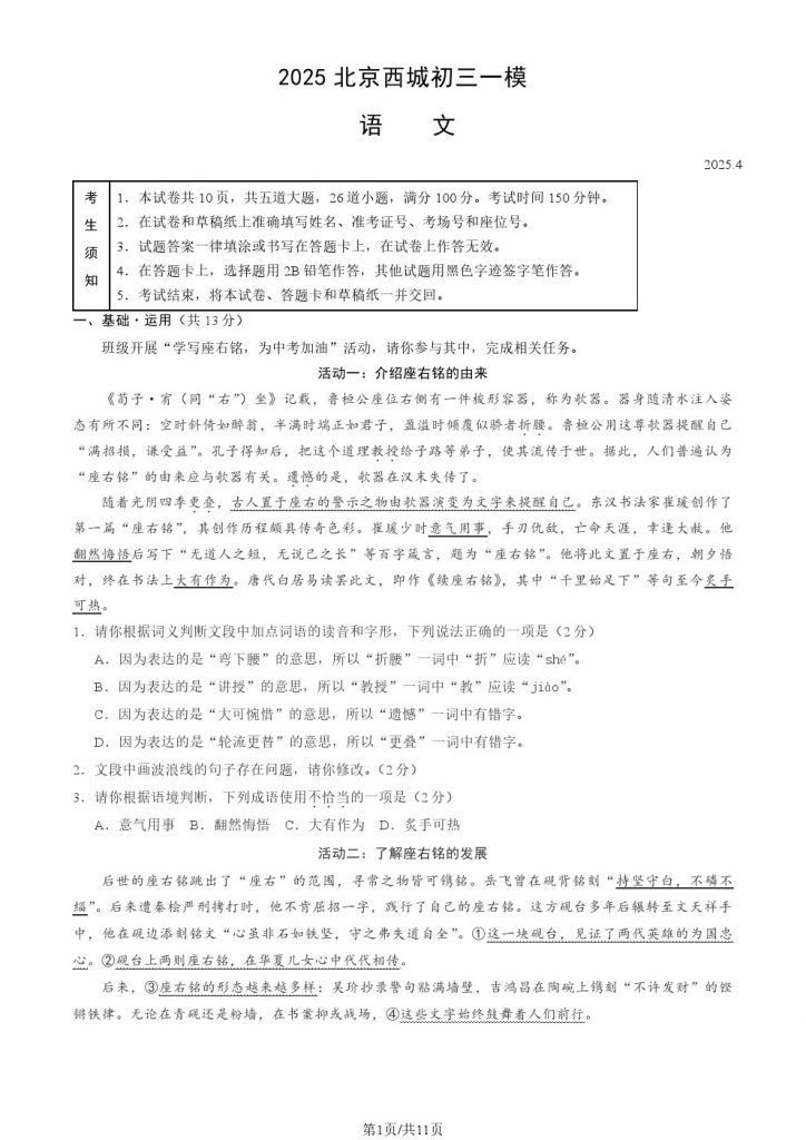 2025北京各区初三一模已陆续开始,北达教研组整理了西城区2025初三一模语文试题及答案,分享给大家。快来下载复习吧。