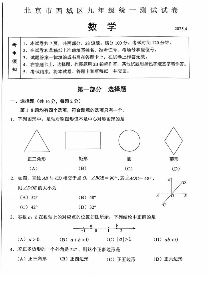 2025北京各区初三一模已陆续开始,北达教研组整理了2025北京西城区初三一模数学试题及答案解析,分享给大家。快来下载复习吧。