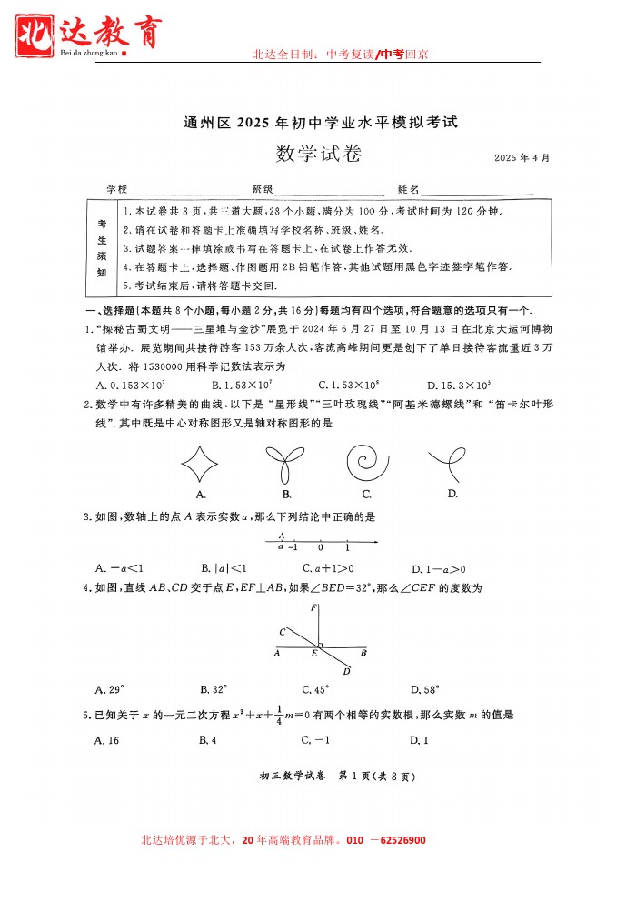 2025北京各区初三一模已陆续开始,北达教研组整理了2025北京通州区初三一模数学试题及答案,分享给大家。快来下载复习吧。