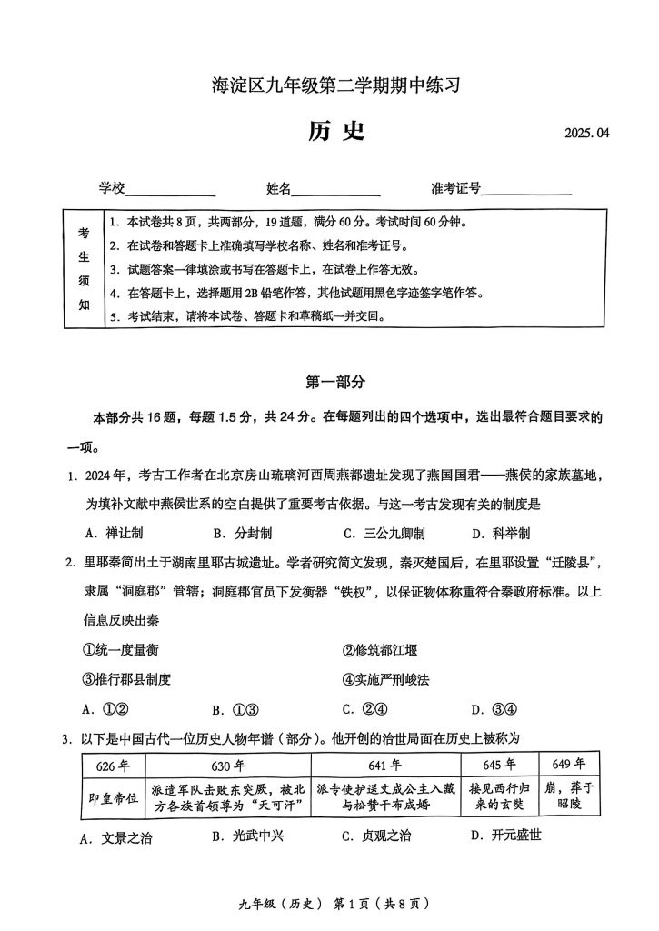 2025北京各区初三一模已陆续开始,北达教研组整理了2025北京海淀区初三一模历史试题,分享给大家。快来下载复习吧。