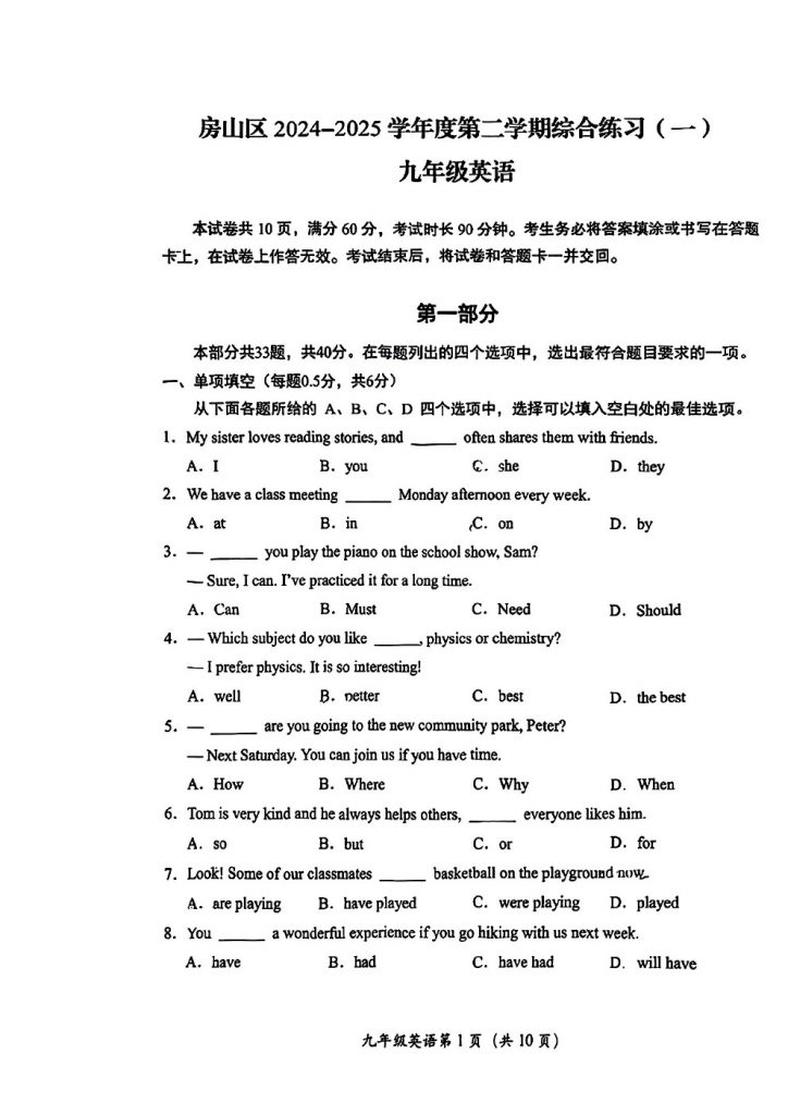 2025北京各区初三一模已陆续开始,北达教研组整理了2025北京房山区初三一模英语试题及答案,分享给大家。快来下载复习吧。