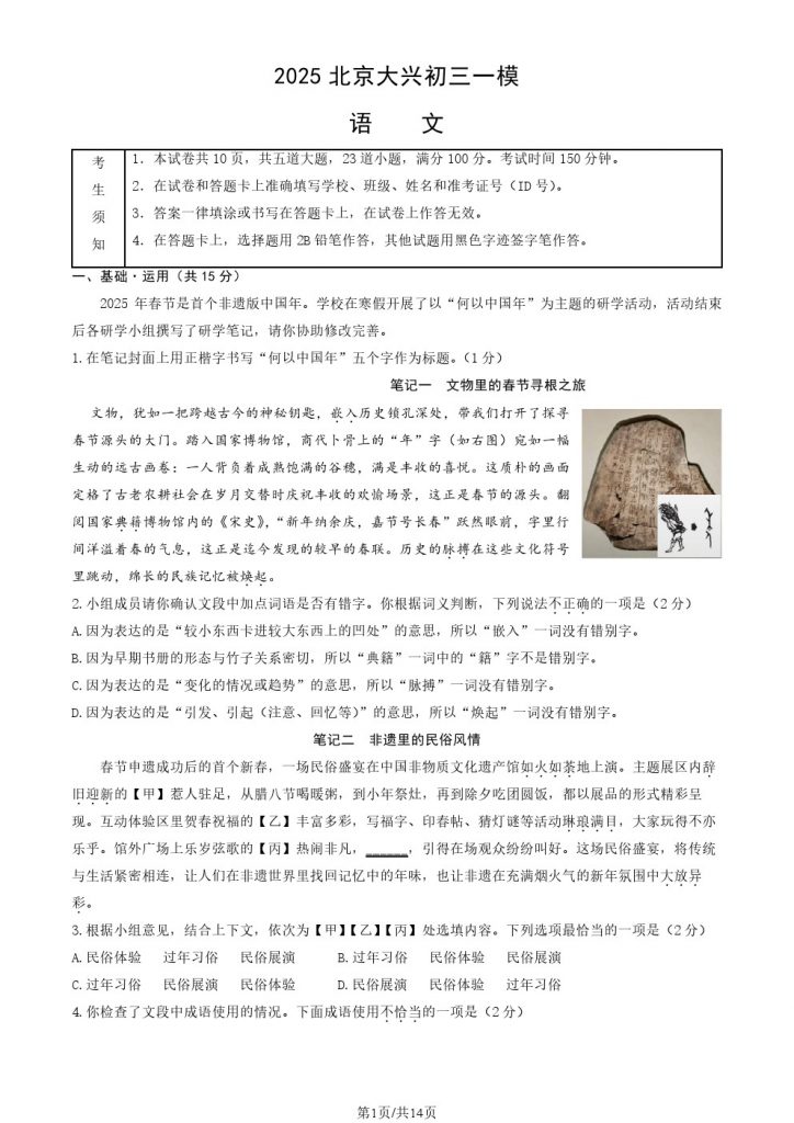 首页 初三试题 2025北京大兴区初三一模语文试题及答案