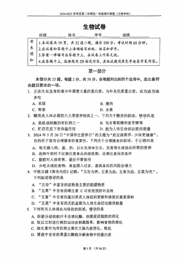 2025北京各区初一期中考已陆续开始,北达教研组整理了2025北京四中初一(下)期中生物试题,分享给大家。