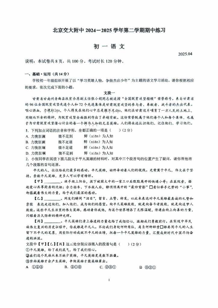2025北京各区初一期中考已陆续开始,北达教研组整理了2025北京交大附中初一(下)期中语文试题,分享给大家。