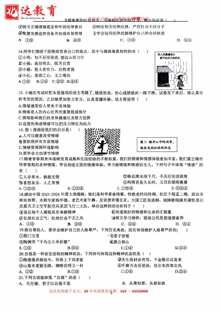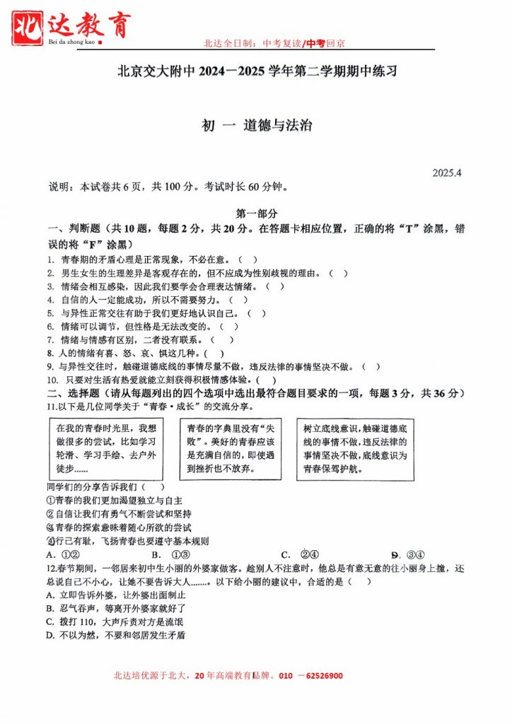 2025北京各区初一期中考已陆续开始,北达教研组整理了2025北京交大附中初一(下)期中道德与法治试题,分享给大家。