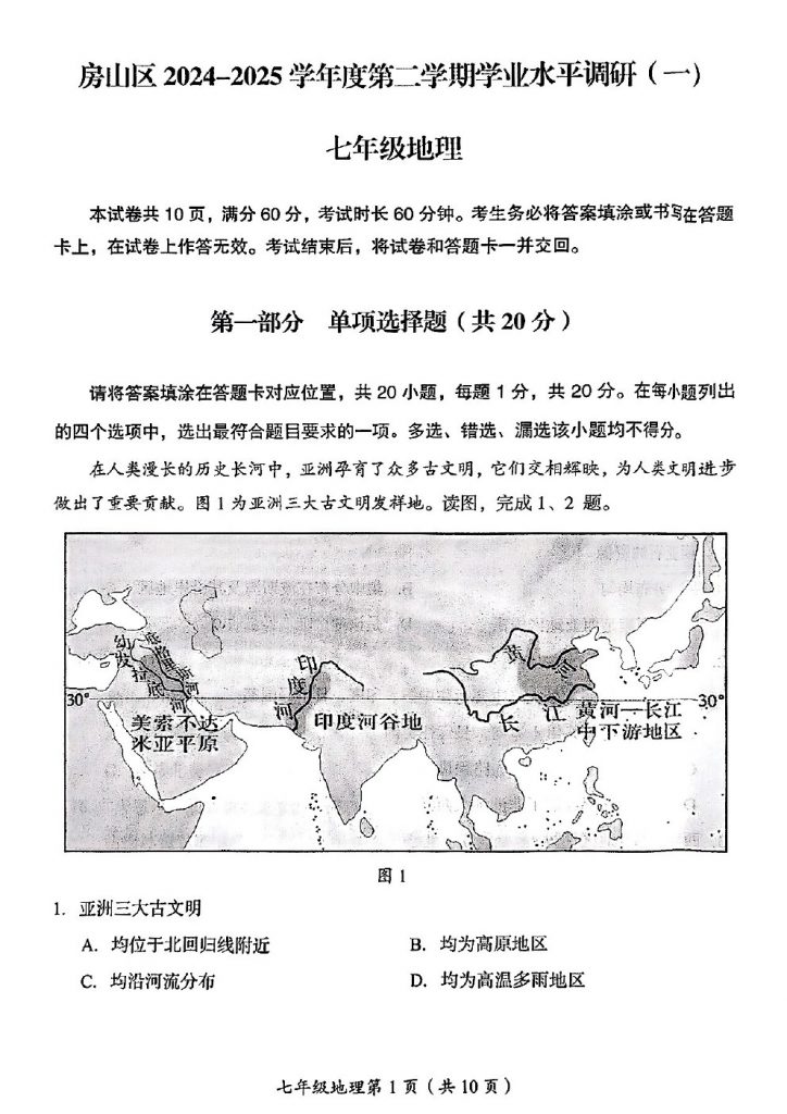 2025北京各区初一期中考已陆续开始,北达教研组整理了2025北京房山初一(下)期中地理试题,分享给大家。