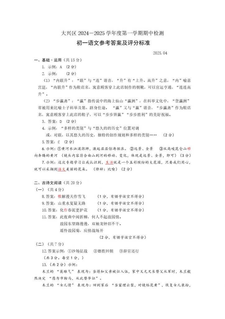 2025北京各区初一期中考已陆续开始,北达教研组整理了北京大兴区2025初一(下)期中语文试题及答案,分享给大家。