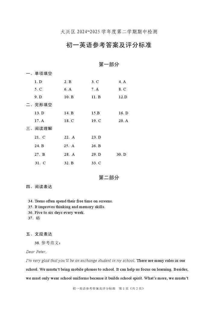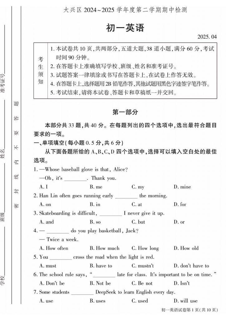 2025北京各区初一期中考已陆续开始,北达教研组整理了2025北京大兴初一(下)期中英语试题及答案,分享给大家。