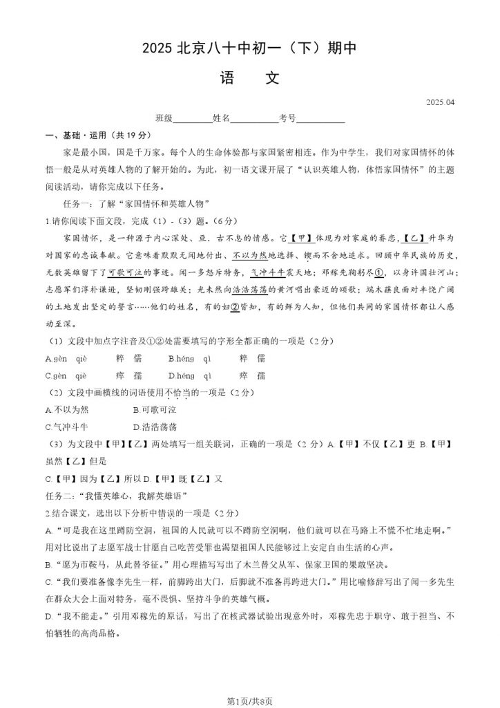 2025北京各区初一期中考已陆续开始,北达教研组整理了2025北京八十中初一(下)期中语文试题,分享给大家。