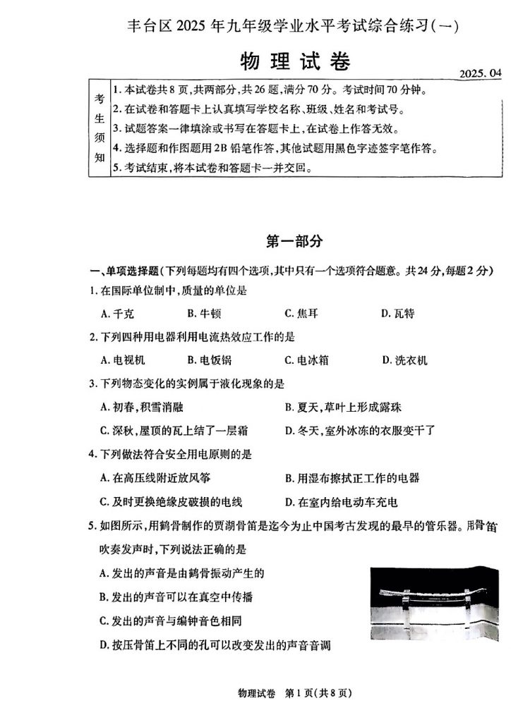 2025北京各区初三一模已陆续开始,北达教研组整理了2025北京丰台区初三一模物理试题及答案,分享给大家。快来下载复习吧。