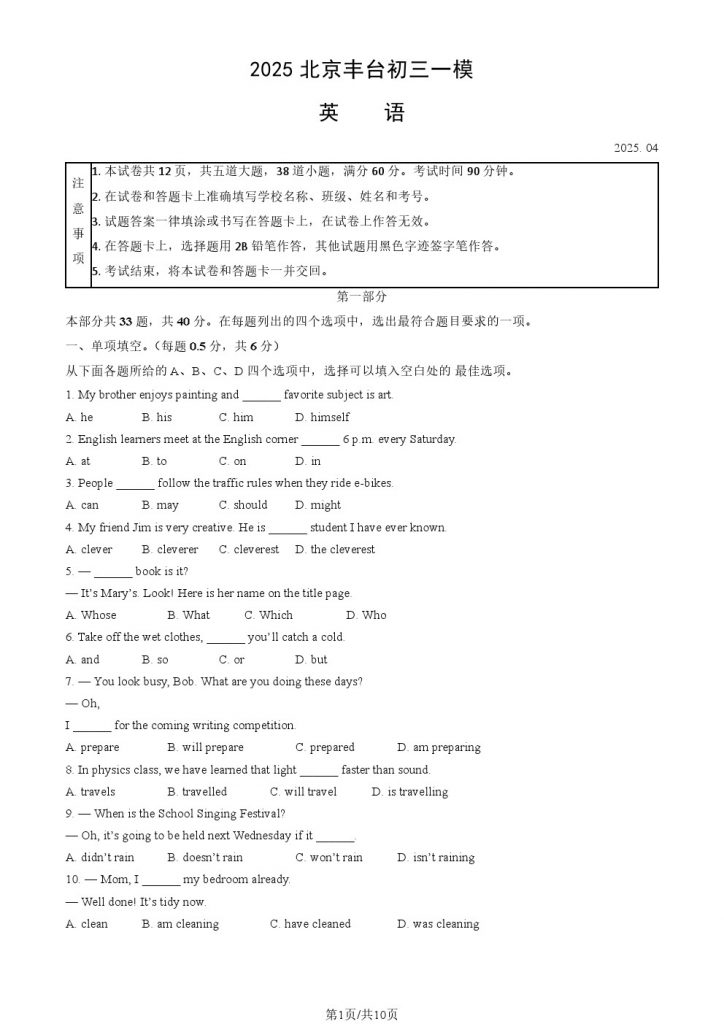 2025北京各区初三一模已陆续开始,北达教研组整理了2025北京丰台区初三一模英语试题及答案,分享给大家。快来下载复习吧。