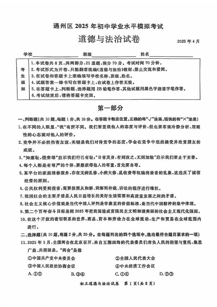 2025北京各区初三一模已陆续开始,北达教研组整理了2025北京通州区初三一模道法试题及答案,分享给大家。快来下载复习吧。