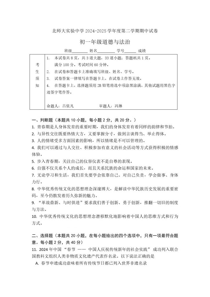 2025北京各区初一期中考已陆续开始,北达教研组整理了北师大实验中学2025初一(下)期中道法试题及答案,分享给大家。
