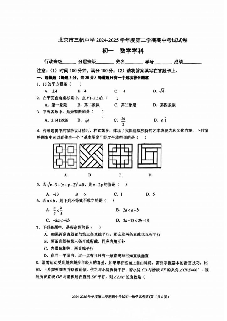 2025北京各区初一期中考已陆续开始,北达教研组整理了2025北京三帆中学初一(下)期中数学试题,分享给大家。