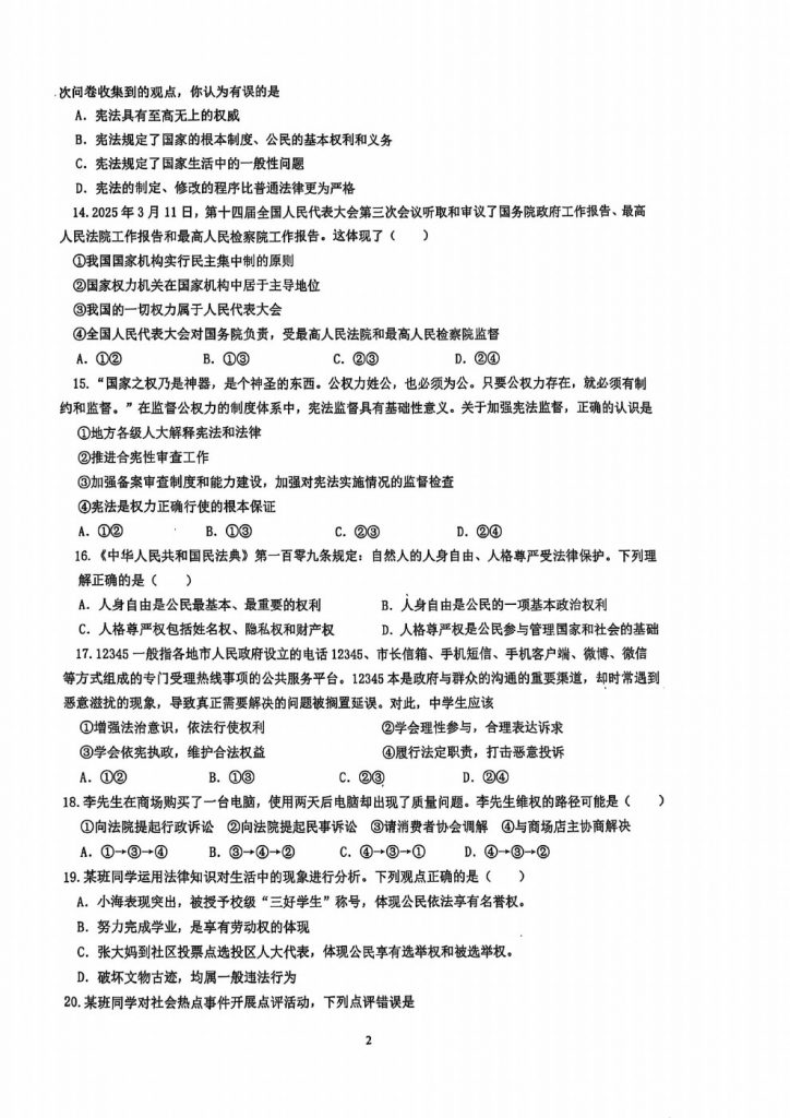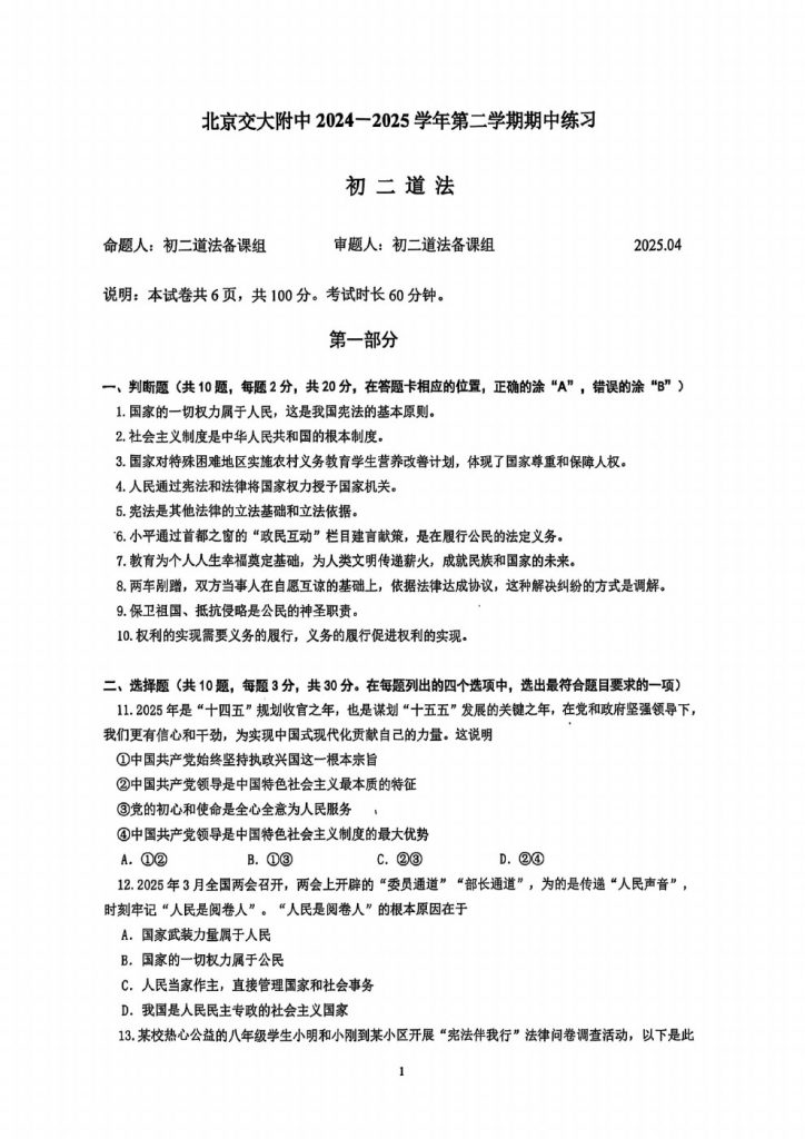2025北京各区初二期中考已陆续开始,北达教研组整理了2025北京交大附中初二(下)期中道德与法治试题,分享给大家。