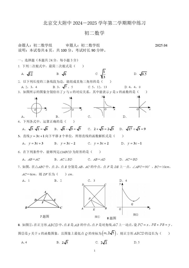 2025北京各区初二期中考已陆续开始,北达教研组整理了交大附中2025初二(下)期中数学试题及答案,分享给大家。