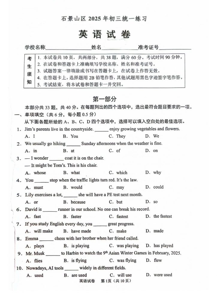 2025北京各区初三一模已陆续开始,北达教研组整理了2025北京石景山区初三一模英语试题及答案,分享给大家。快来下载复习吧。
