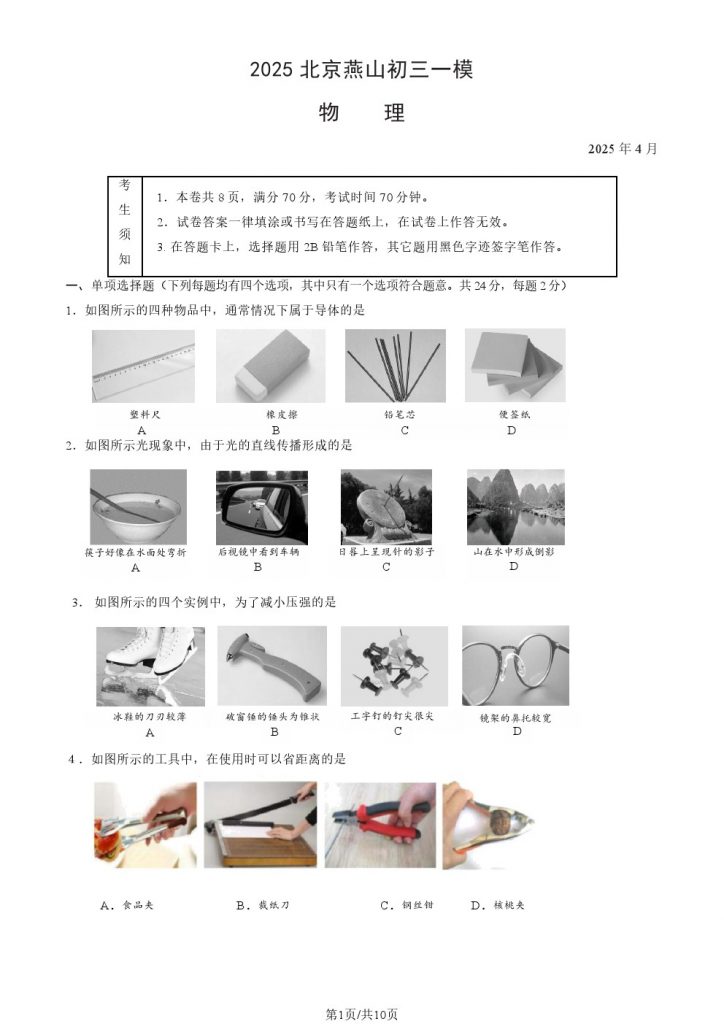 2025北京各区初三一模已陆续开始,北达教研组整理了2025北京燕山区初三一模物理试题及答案,分享给大家。快来下载复习吧。