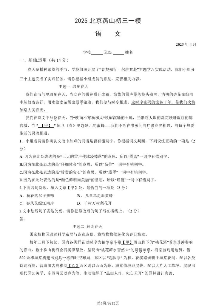 2025北京各区初三一模已陆续开始,北达教研组整理了2025北京燕山区初三一模语文试题及答案,分享给大家。快来下载复习吧。