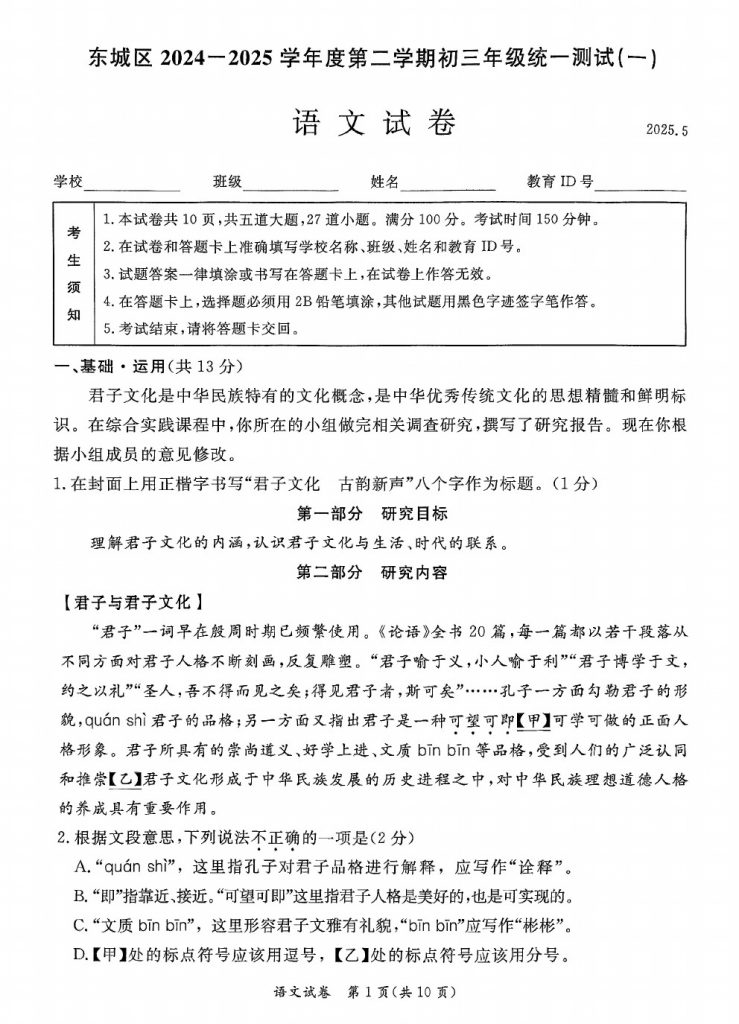 2025北京各区初三一模已陆续开始,北达教研组整理了2025北京东城区初三一模语文试题及答案,分享给大家。快来下载复习吧。