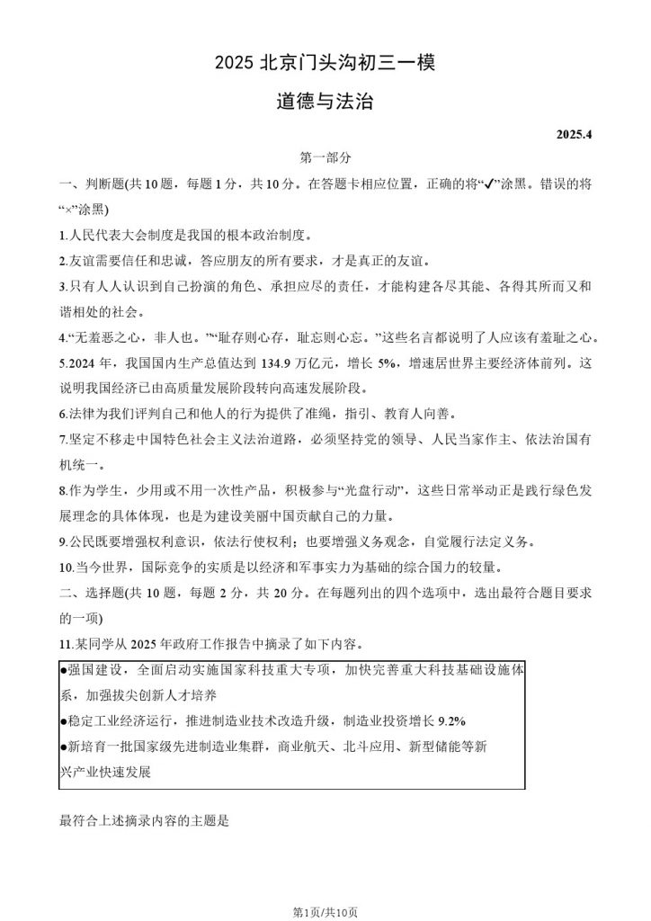 2025北京各区初三一模已陆续开始,北达教研组整理了2025北京门头沟初三一模道德与法治试题及答案,分享给大家。快来下载复习吧。