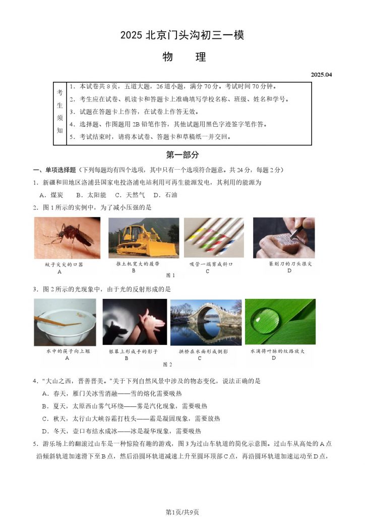 2025北京各区初三一模已陆续开始,北达教研组整理了2025北京门头沟区初三一模物理试题及答案,分享给大家。快来下载复习吧。