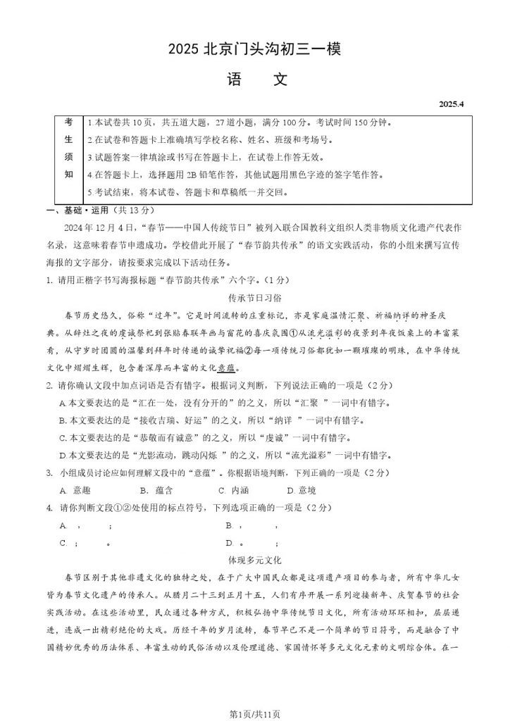 2025北京各区初三一模已陆续开始,北达教研组整理了北京门头沟2025初三一模语文试题及答案,分享给大家。快来下载复习吧。