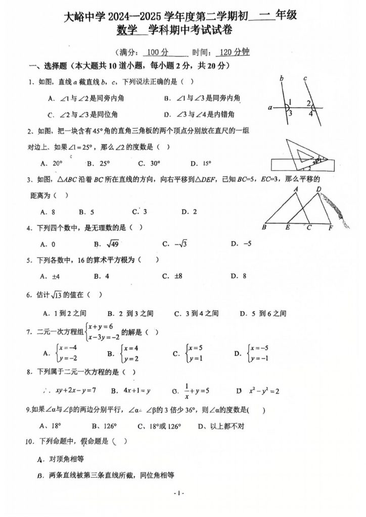 2025北京各区初一期中考已陆续开始,北达教研组整理了2025大峪中学初一(下)期中数学试题,分享给大家。