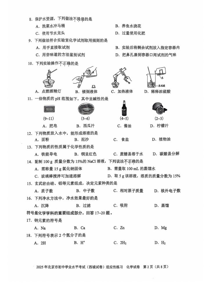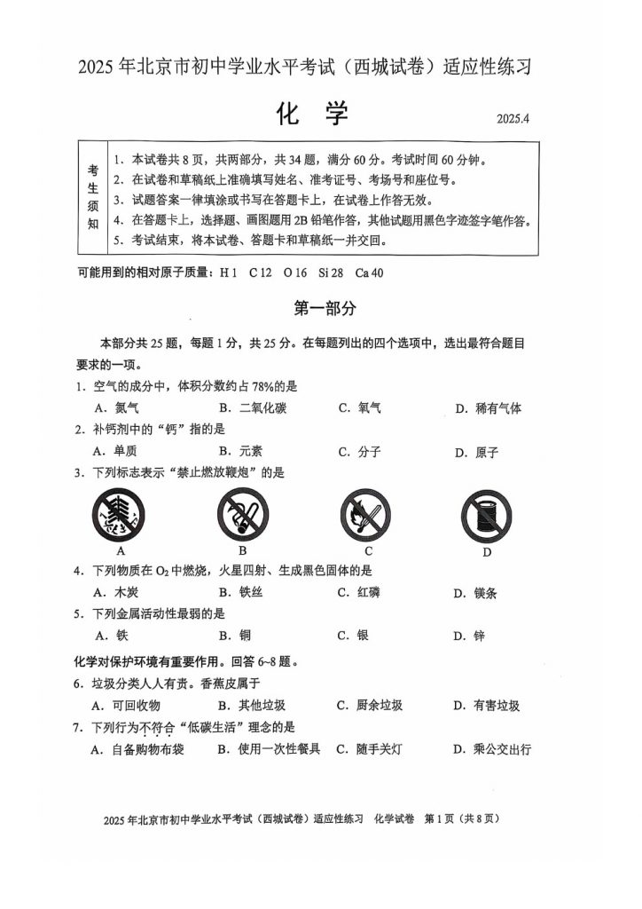 北达教研组整理了2025年西城中考适应性练习化学试题及答案,分享给大家。