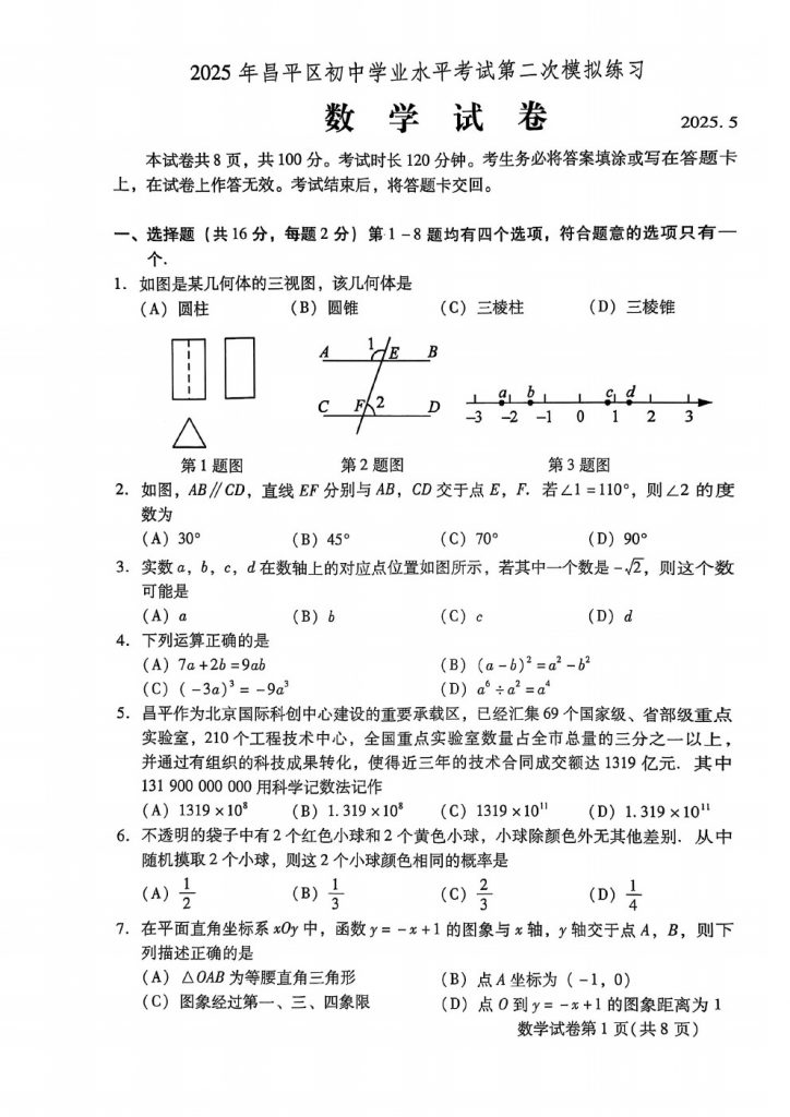 2025北京各区初三二模已陆续开始,北达教研组整理了2025北京昌平区初三二模数学试题及答案,分享给大家。