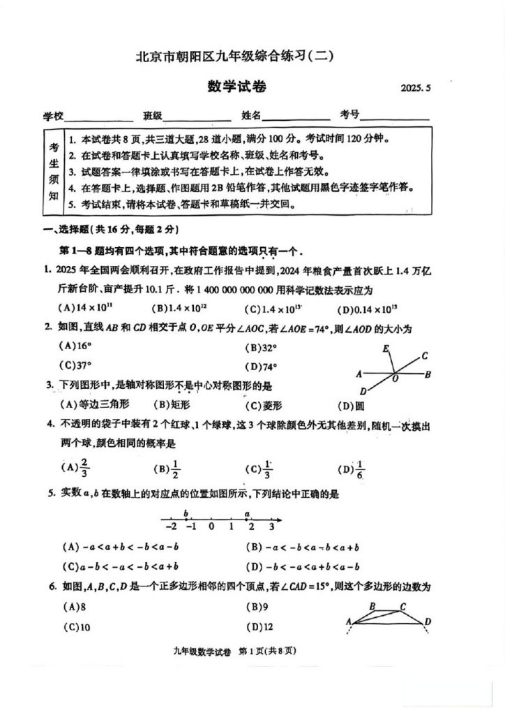 2025北京各区初三二模已陆续开始,北达教研组整理了22025朝阳区初三二模数学试题及答案,分享给大家。
